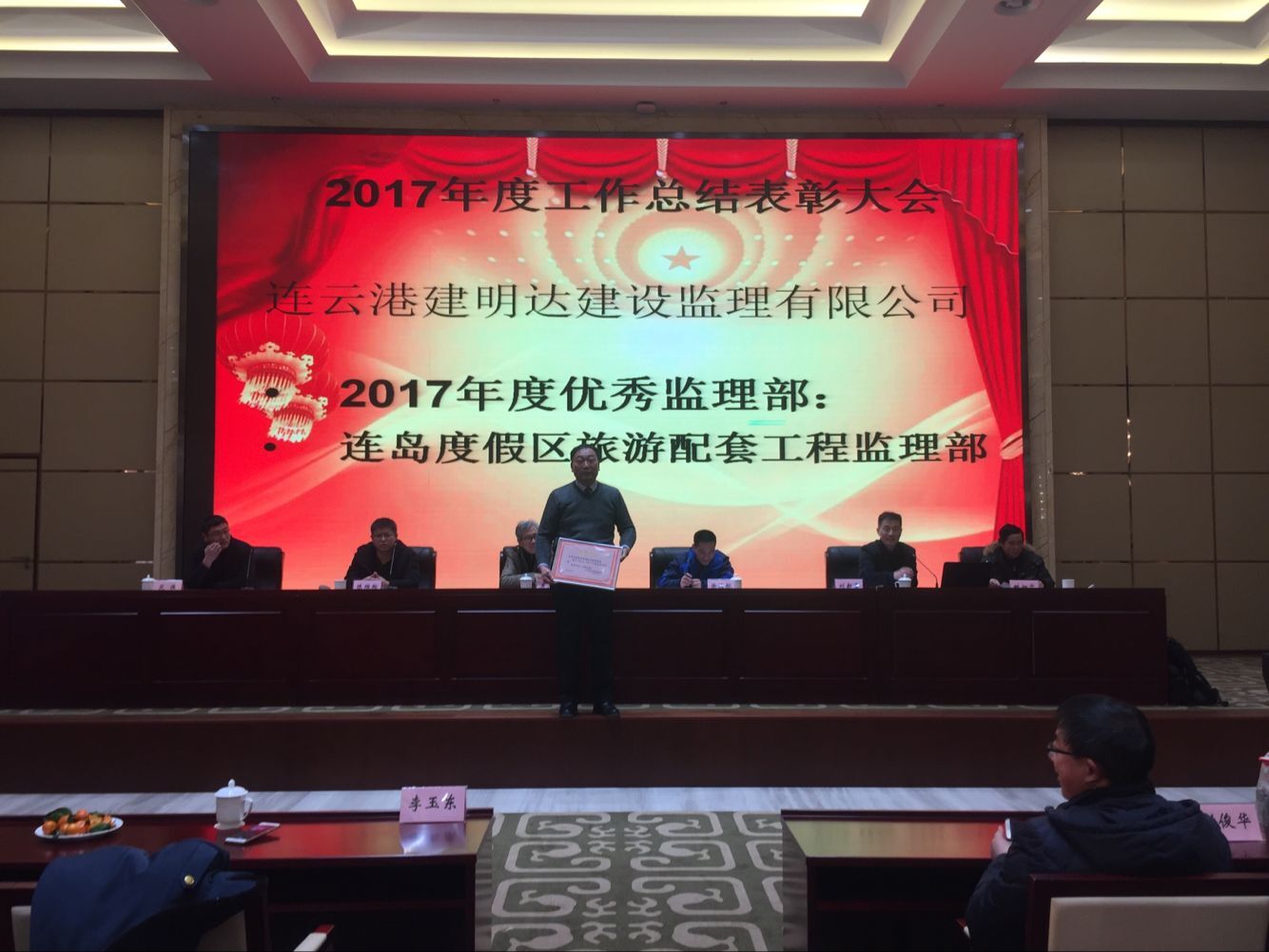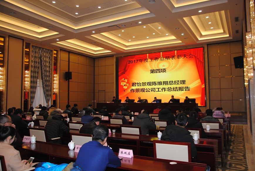 下午五點,2017年工作總結(jié)表彰大會在溫泉大酒店會議中心準(zhǔn)時召開??偣径聲I(lǐng)導(dǎo)李清洋、王家松、徐遠(yuǎn)航,君怡景觀公司總經(jīng)理,建明達(dá)監(jiān)理公司總經(jīng)理劉新吉,建明達(dá)監(jiān)理公司總工姚加千,各職能部門經(jīng)理、各項目總監(jiān)及全體員工參加了大會。