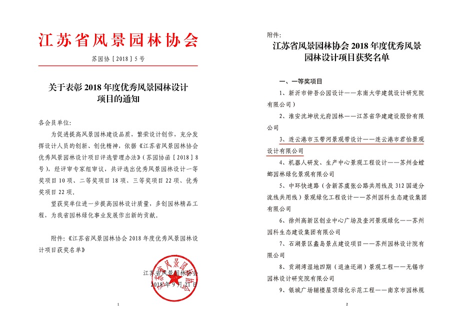10月18日喜訊,近日江蘇省風(fēng)景園林協(xié)會發(fā)布《關(guān)于表彰2018年度優(yōu)秀風(fēng)景園林設(shè)計項目的通知》,我司景觀設(shè)計項目連云港市玉帶河景觀帶設(shè)計榮獲2018年度省優(yōu)秀風(fēng)景園林設(shè)計項目一等獎。同時秦山島旅游規(guī)劃景觀設(shè)計榮獲省三等獎,贛榆和安湖濕地公園景觀設(shè)計榮獲省優(yōu)秀項目獎。