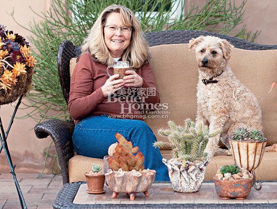 Jeanne也喜歡自己組多肉植物盆栽,常用到的素材是墨西哥景天,比如新玉綴、金色的銘月,它們的葉片只有子彈大小,但是沒有它們的歐洲替代品種那么耐寒。通常,這些歐洲的替代品種的葉片會(huì)更袖珍。在有花園聚會(huì)或朋友到訪的時(shí)候,Barry會(huì)開著車接送客人駛過花園中悠長而陡峭的車道,沿途人們看到他們豐盛的多肉植物花園,第一反應(yīng)就是回去自己也要設(shè)計(jì)一個(gè)同樣的花園,鏟除原來花園里的草坪,甚至還有些朋友強(qiáng)烈要求下次帶自己的花園設(shè)計(jì)師過來取經(jīng)。這個(gè)用多肉植物和仙人掌組成的低水需花園已經(jīng)是周圍人紛紛效仿的典范。