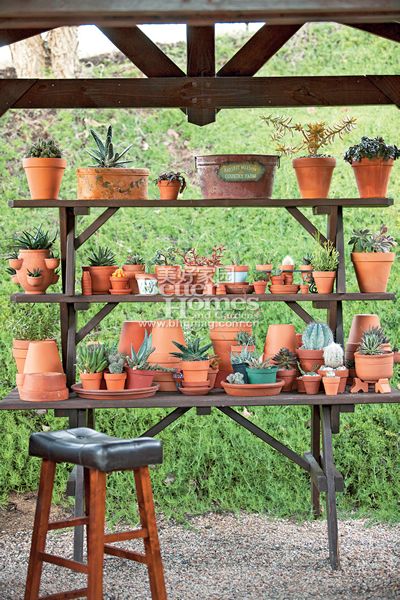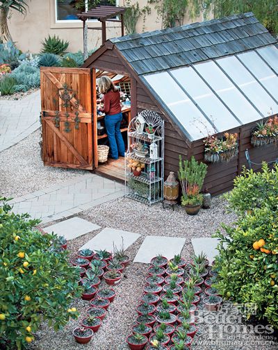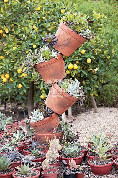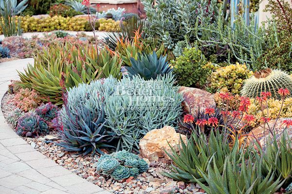 花園工具房里存放著整碗的彩色碎玻璃,它們是Jeanne用來裝飾盆栽的,透過天窗的光線閃閃發(fā)光。附近的小木屋則用來庇護(hù)她的植物和繁殖新的幼苗,根據(jù)季節(jié)Jeanne會(huì)從高抬花床收獲到沙拉菜、番茄、南瓜、草莓和十幾種香草。夏天,她喜歡用綠薄荷的葉和冰水調(diào)制飲料。盡管蔬菜花園里的作物看起來與外邊的多肉植物、仙人掌風(fēng)格相差甚遠(yuǎn),但它們的位置集中在幾處島狀的區(qū)域,通過的重復(fù)景觀的手法,讓它們看起來不那么突兀。從視覺的角度說,也促進(jìn)了房子與花園中黃褐色的灰泥矮墻之間的協(xié)調(diào)問題。雖然花園的設(shè)計(jì)是以耐干旱為主題,這并不意味著花園沒有完善的灌溉系統(tǒng)。畢竟南加利福尼亞州有時(shí)會(huì)出現(xiàn)幾個(gè)月無降雨的情況,此時(shí)就需要灌溉系統(tǒng)登場。多肉植物雖不像養(yǎng)護(hù)草坪、玫瑰或一年生植物那樣費(fèi)水,但常規(guī)的給水會(huì)讓它們有最出色的表現(xiàn)。